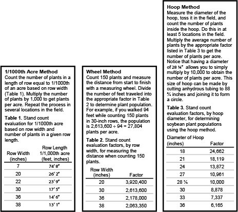 Three common methods for taking stand counts are outlined below. The 1/1000th acre method is widely used for corn and wide-row soybeans. A more accurate method is the wheel method, which counts 150 plants and measures the distance from start to finish with a measuring wheel. The hoop method is often used for drilled beans.