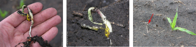 In addition to successful germination, successful emergence of corn seedlings is an important early step in successful stand establishment. The synchronization of coleoptile development and the cessation of mesocotyl elongation usually results in the appearance of the first leaf from the tip of the coleoptile just as the coleoptile breaks the soil surface. Occasionally, the first leaf instead emerges underground, often trapping the remainder of the young whorl below the soil surface, causing eventual stunting or death of the affected plant. Such leafing out underground can be caused by several factors. One factor may be physical restriction of coleoptile penetration through the soil due to dense surface soil crusting. A similar physical restriction of coleoptile penetration can occur in response to severe seed furrow sidewall compaction and heavy down-pressure settings on planter closing wheels.
