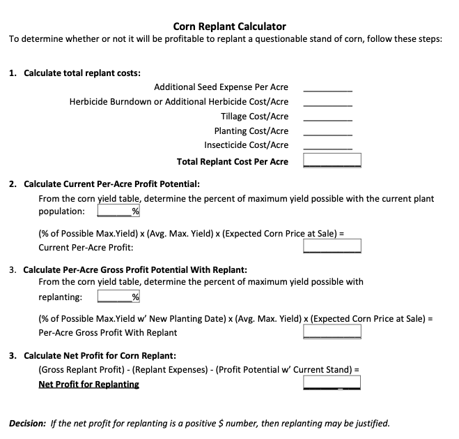 Now is the time when corn producers should be out in their fields assessing stands to determine if replanting is necessary. Replant decisions are never easy and are ultimately determined by which decision provides the greatest net income.