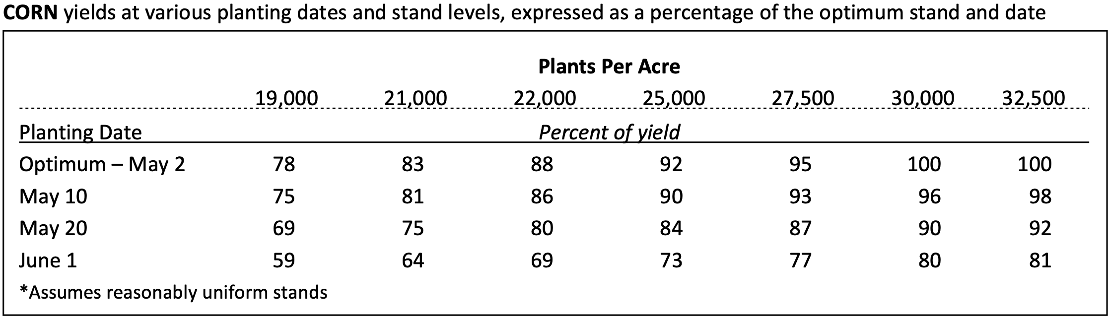 There is a decided yield penalty for delayed planting. The tables below can be used for general replant guidelines and shows most recent data on stand levels and planting dates. Although growing season, location, hybrid, and other factors may cause some variation in the data, the information in the table will serve as a good starting point for making replant decisions.