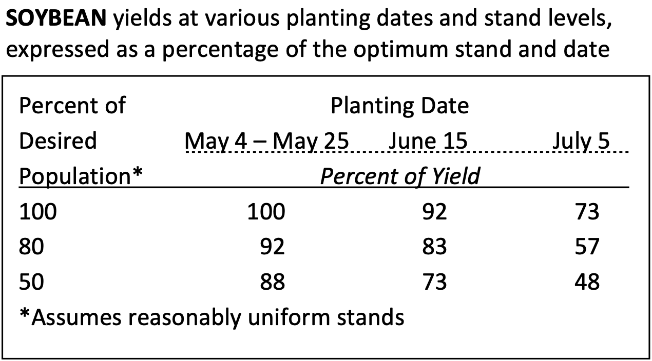 Soybean plants readily compensate for stand variations. Usually a 50% stand, if planted at a normal time, will not justify replanting. When replanting or double cropping soybeans, switching to a “too early” variety can be costly. Becausesoybeans are day-length sensitive, adapted medium-full season maturities can be planted until about June 10. After that date, adapted medium maturity varieties for your area should be planted.