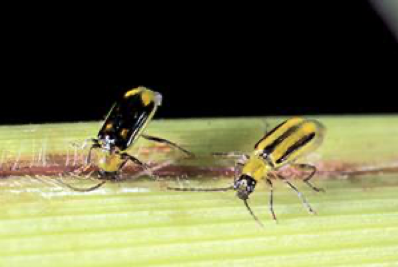 Larval feeding can decrease yield potential and increase the risk of root lodging. Larvae feed on roots for approximately three weeks, which is the time it takes to reach pupation. Adult emergence begins in early July with peak emergence occurring around the beginning of August. Adult beetles feed on corn leaves, pollen, and soft kernels, but cause the most damage when feeding on silks.