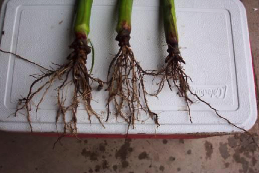 Assess control strategy with root damage ratings. Since root damage cannot be seen above ground, root digs are imperative to help assess your current corn rootworm management strategy. Scouting for CRW larval damage should take Place the end of June to mid-July. To do so, dig a series of corn root balls (one foot in diameter), shake off the soil, and wash roots. Root damage due to corn rootworm larval feeding consists of brown feeding scars often along the side of the roots, tunneling inside the larger roots, and root pruning with the roots eaten back toward the base of the stalk. Injury may be limited to a single root, or consist of multiple whorls of roots chewed back.
