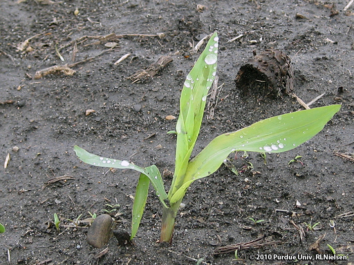 Up until about the three leaf stage (determined by number of visible leaf collars), corn seedlings are dependent primarily on the energy and nutrition reserves of the kernel to sustain their development. Beyond the three leaf stage, seedlings increasingly "wean" themselves from the kernel reserves and slowly become more dependent on the developing nodal root system.